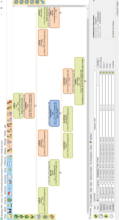 La Tour-d’Aigues a été choisie simplement parce qu’elle est le lieu où vécut longuement la famille Lombard, l’une des trois familles étudiées. C’est dans ce bourg d’environ 1300 habitants en 1793 que s’installa Salomon Lombard de manière définitive vers 1645 alors qu’il y avait déjà des affaires et au moins une propriété depuis les années 1620. Les sources employées ont été choisies par rapport à un objectif de meilleure compréhension de cette famille et de son influence (ou non-influence) dans ce bourg. Dans un travail de reconstitution, largement inspiré de celui de Giovanni Levi à Santena, nous avons opté pour le dépouillement systématique et la reconstitution des familles à partir des registres paroissiaux sur la période sans lacunes 1668-1790. Environ 20 000 actes ont été relevés et 21 321 fiches individuelles ont été produites grâce au logiciel Geneatique dans sa version 2016. Ainsi, ces fiches individuelles sont-elles liées, autant que possible, par des relations généalogiques, comme le montre l’exemple de la page suivante. Les doublons ont bien sûr été évités au maximum malgré les cas d’homonymie. Dans le cas de la graphie, contrairement aux travaux de Gabriel Audisio sur Apt ou sur le notariat, nous avons opté pour une uniformisation. Cela permet d’éviter, pour le logiciel, de ne pas trouver Marianne Lombarde si nous tapons Marie Anne Lombard. En uniformisant, nous évitons ainsi la création de doublons et naviguons plus facilement dans ce qui s’apparente à un arbre généalogique communal. En complément, des incursions ont été faites dans plusieurs dizaines de registres notariés (cf. Sources) sur les 200 qui couvrent la période 1620-1800 pour cette seule commune. Ils ont permis de « remonter les branches » et donc de relier des familles mais aussi de voir s’articuler les stratégies familiales par les dots lors des contrats de mariages ou lors des clauses testamentaires. À ce jour, l’objectif est de relever tous les CM et les testaments de cette période afin de les analyser et de les confronter à ce que ce mémoire tentera déjà de montrer ; en somme, de l’approfondir davantage.