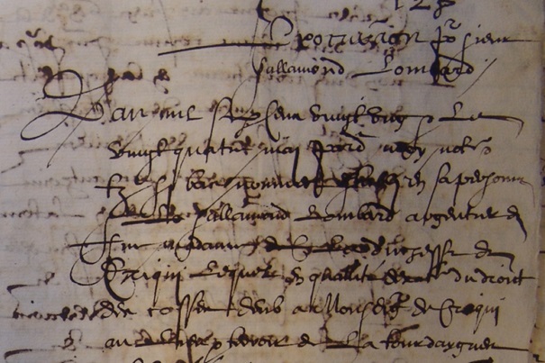 « L’an mil six cens vingt ung et le vingt quatre may pardevant moy notere et tesmoings sy bas nommés estably en sa personne [biffé : le] Sallamond Lombard argentier de fue madame [biffé : de C] la duchesse de Crequi lequel en quallité dexecuteur du droict des cosses deub a Monseigneur de Crequi au lieu et terroir de la Tour d’Aygues »