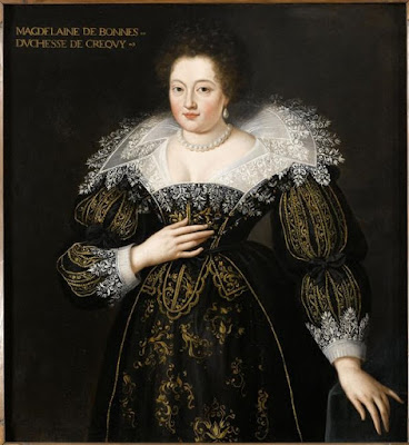 Salomon Lombard était donc l’argentier de la duchesse de Créquy. Pour qui connaît la généalogie des Créquy, le lien entre le baptême et cette procuration saute aux yeux. Mais, il faut procéder par étape. Qui était la duchesse de Créquy ? Il y en eut plusieurs au XVIIe siècle, mais seule une était décédée avant 1621 : Madeleine de Bonne, effectivement décédée en janvier 1621.