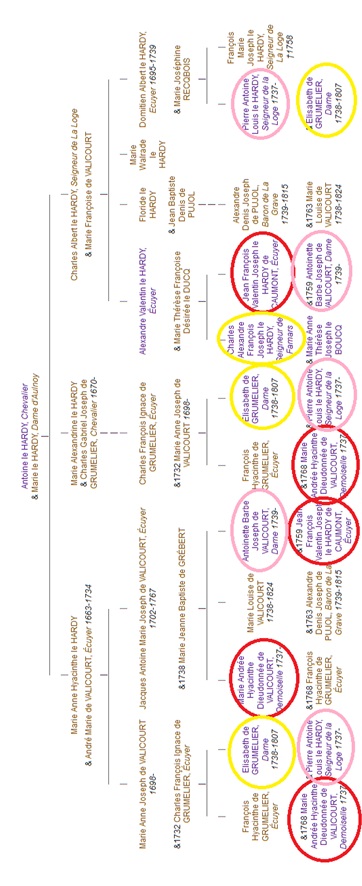 Les liens entre les Le Hardy, les Valicourt et les Grumelier sont matrimoniaux. À la page suivante est reproduit un arbre généalogie que l’on a réalisé de la descendance d’Antoine Le Hardy.